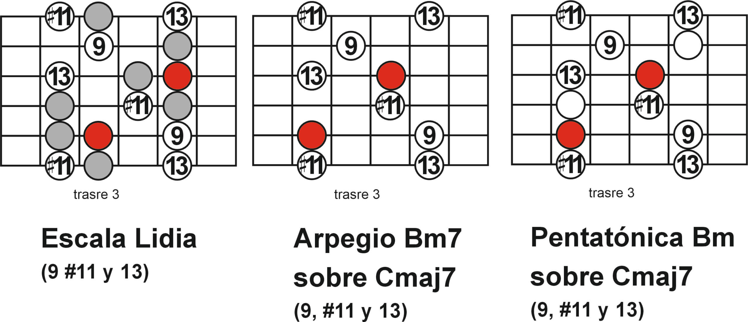 Las diferentes escalas o arpegios que podemos utilizar estarán definidas por las tensiones que agregamos (9, 11 o 13).