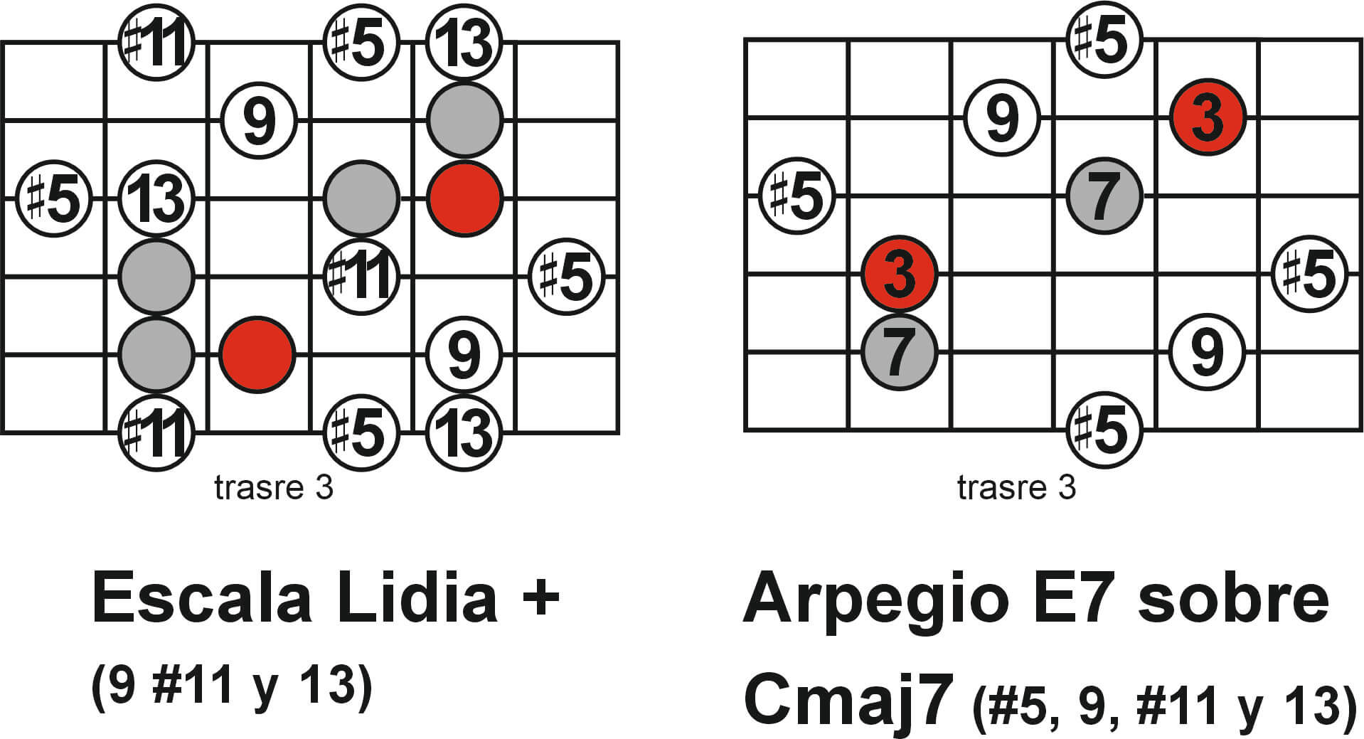 Para hacer sonar esas tensiones podemos valernos de algunos arpegios sustitutos sonando sobre el acorde de Cmaj7.
