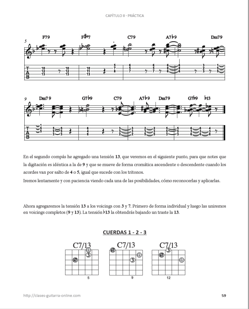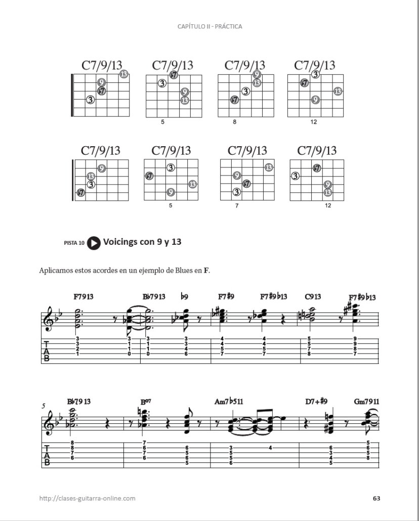 - Voicings dominanres con 9, b9, #9, 13 y b13 en todo el diapasón.